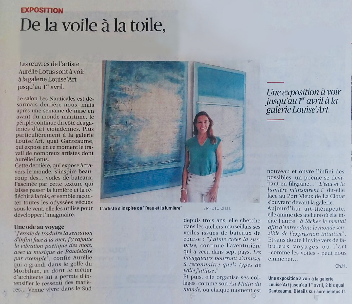Article written by the newspaper " La Provence" focusing on my artworks series created from kevlar recycled boat sails, exhibited in Louiseart gallery in La Ciotat, March 2024.