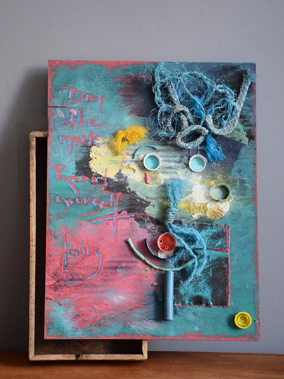 "The Cat" & " Drop your Mask" - 2019 - Ocean plastic waste on recycled wood - 50x35cm & 55x40cm